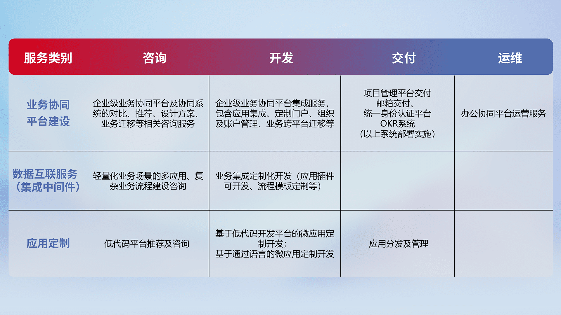 针对钉钉、、、企微、、IDaas等平台级产品提供产品的规划、、、方案、、交付、、定制化开发等服务,,,,实现如统一协同办公、、、智能客户服务、、、、混合会议管理、、、智能数据查询、、等业务场景,,,,实现数字化转型。。。。