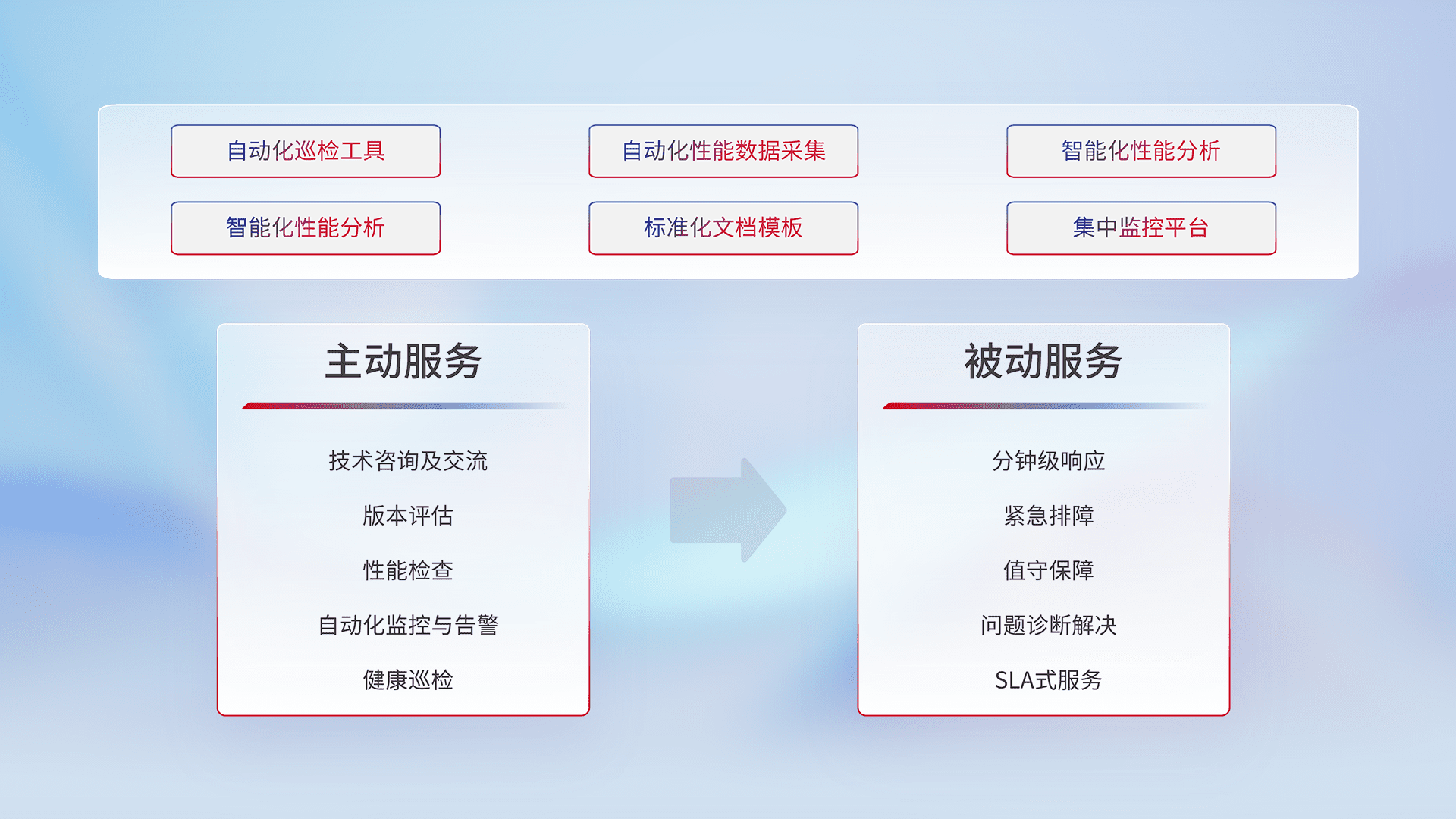 智能化工具和标准化文档,,保障服务质量,,提供主动服务(包含技术咨询、、、版本评估、、、、性能检查、、、、自动化监控与告警、、、、健康巡检)和被动服务包含(分钟级响应、、、紧急排障、、、值守保障、、、问题诊断解决、、SLA服务)。。。。